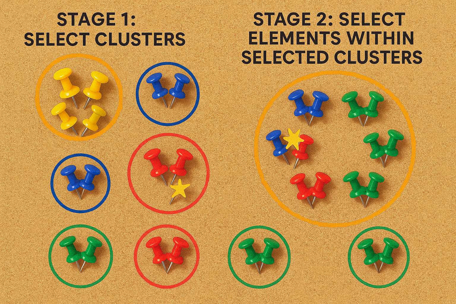 - Multistage Sample: begins like cluster sampling, but then takes random samples within selected clusters.