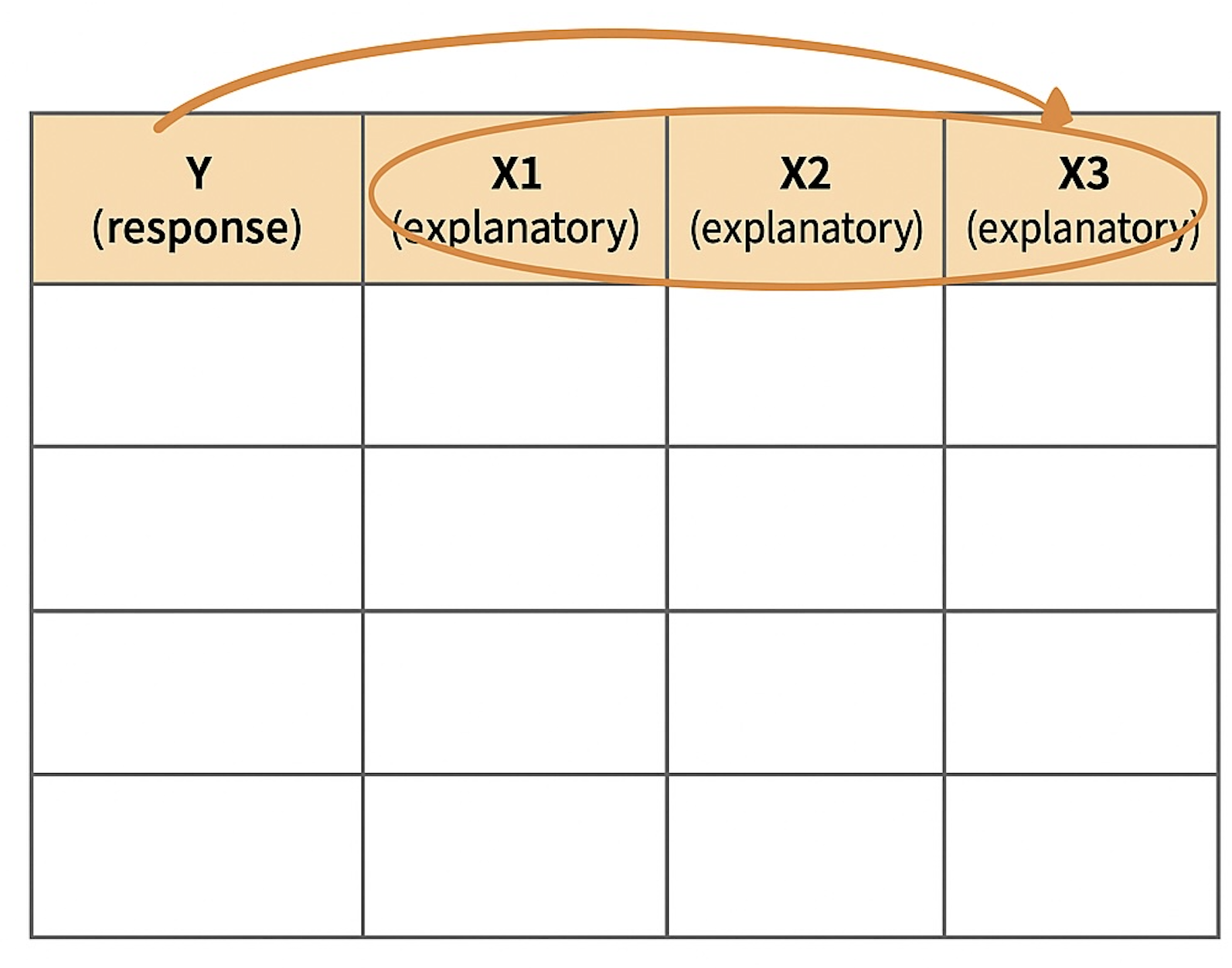 - Explanatory variable (x): the factor believed to influence the outcome.